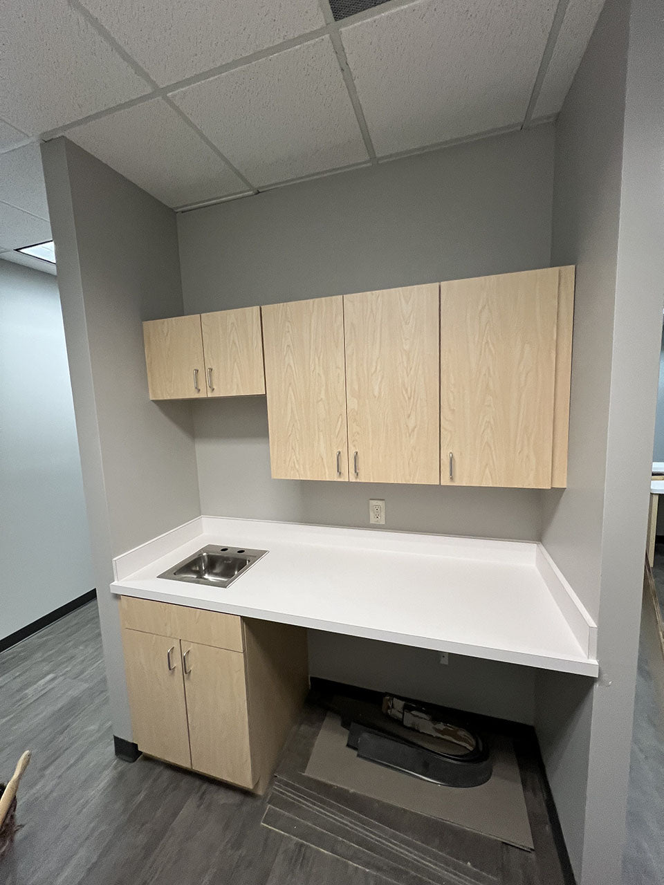 This project involved the fabrication and installation of new laminate countertops and cabinets across several areas, including four exam rooms, a charting room, medical assistant room, breakroom, and reception.