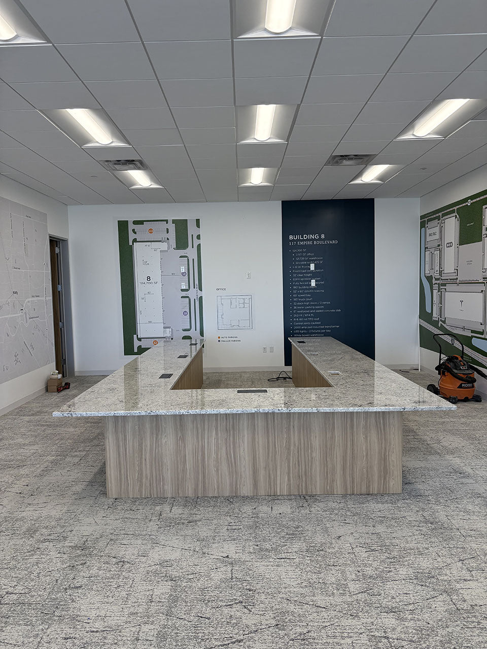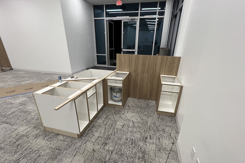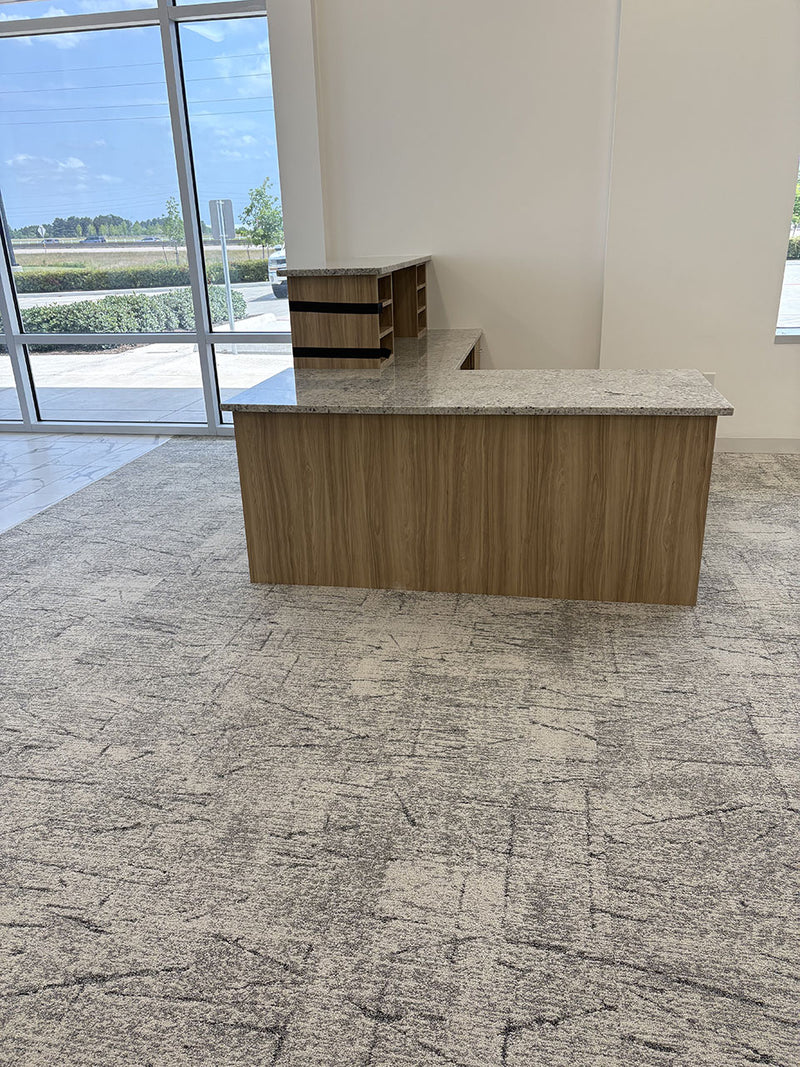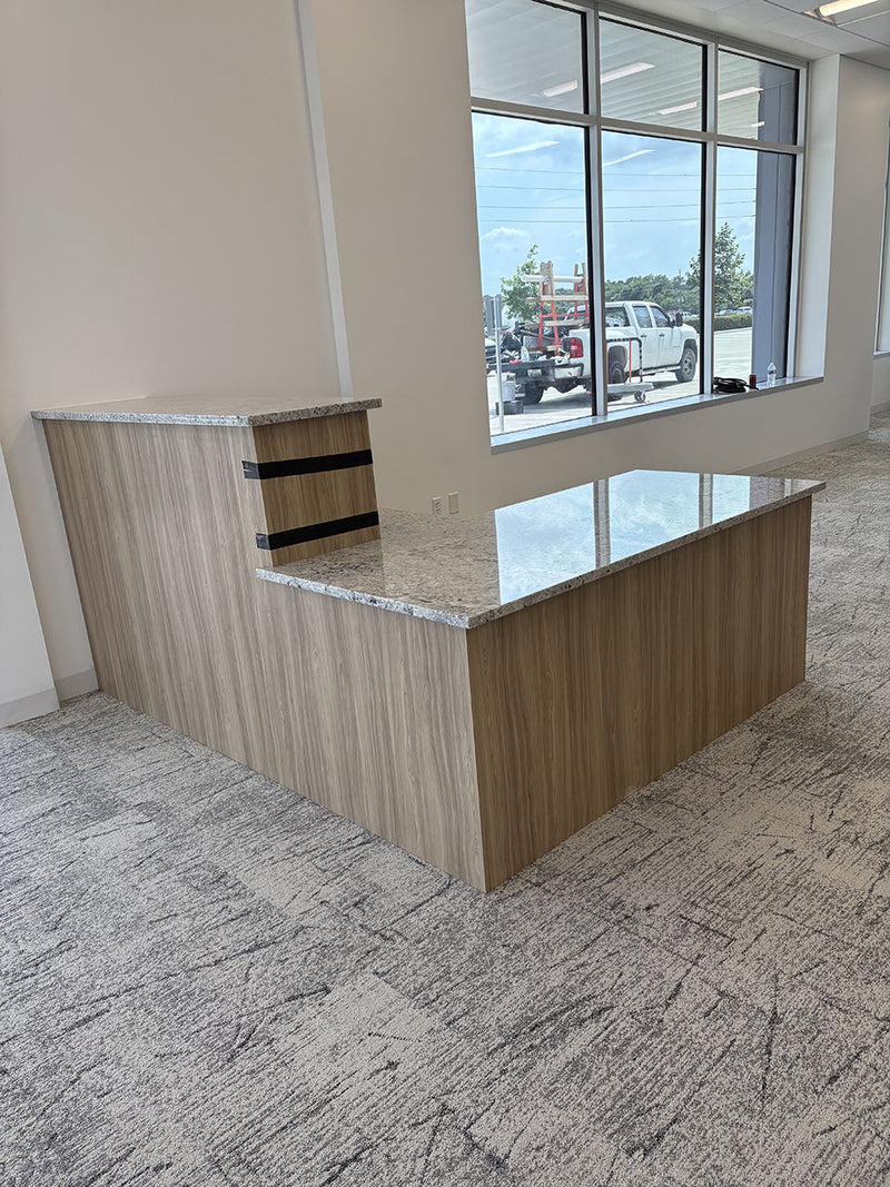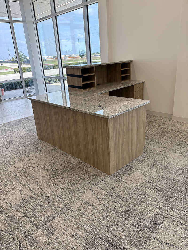 This commercial project included the fabrication and installation of granite countertops, granite wall panels, and laminate base cabinets across several areas including the breakroom, reception, and conference room.