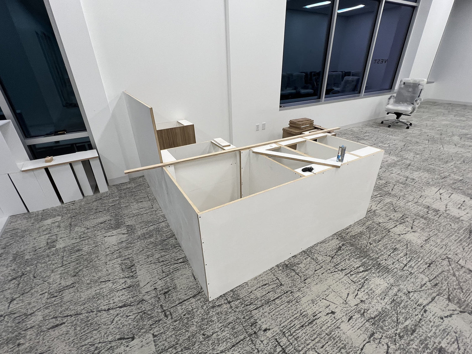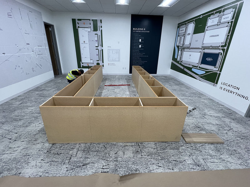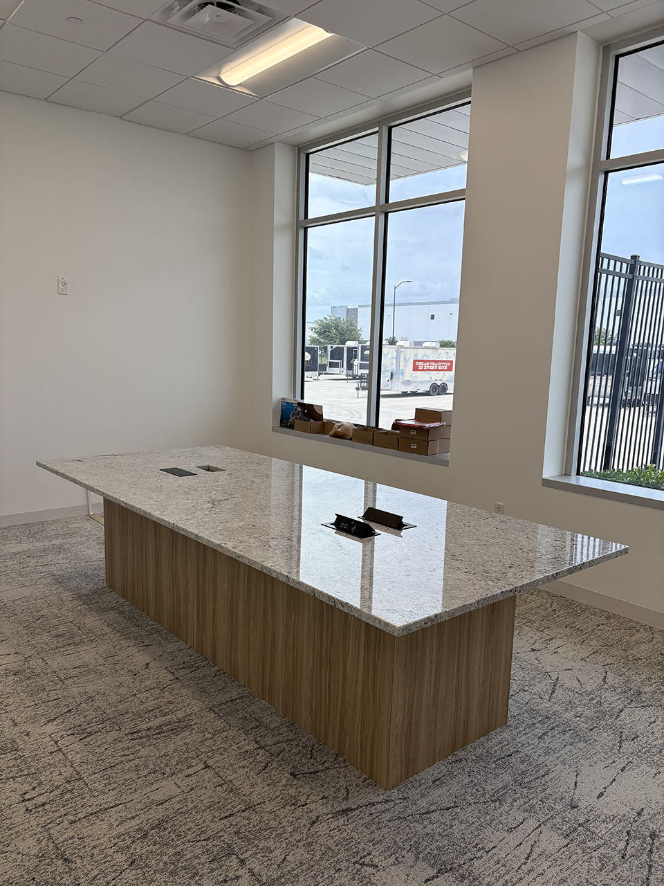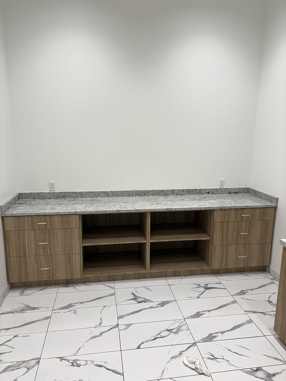 This commercial project included the fabrication and installation of granite countertops, granite wall panels, and laminate base cabinets across several areas including the breakroom, reception, and conference room.